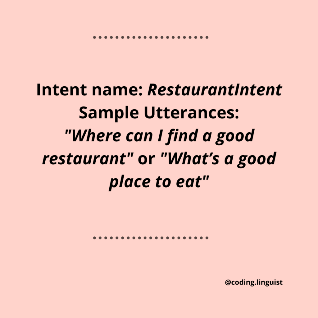 Name: “RestaurantIntent” Utterances: “Where can I find a good restaurant” or “What’s a good place to eat”.